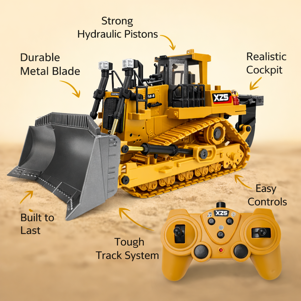 Bring real construction power to playtime with the Zoblex™ RC Bulldozer — a realistic, heavy-duty remote control vehicle designed for young builders who love big machines. Built with durable alloy parts and reinforced plastic, this bulldozer delivers strong pushing power, smooth driving, and authentic job-site action.